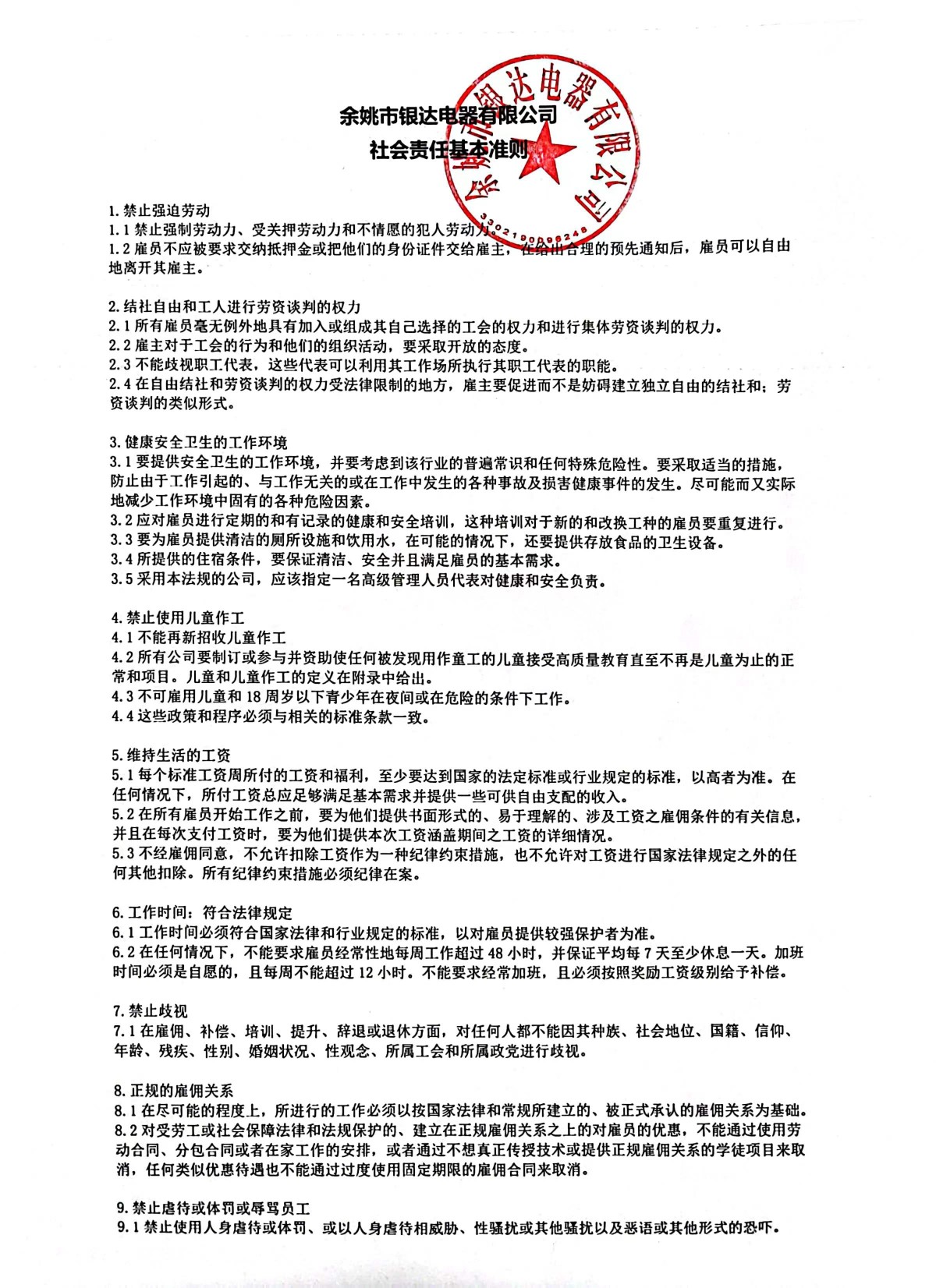 余姚市銀達電器有限公司社會責任基本準則